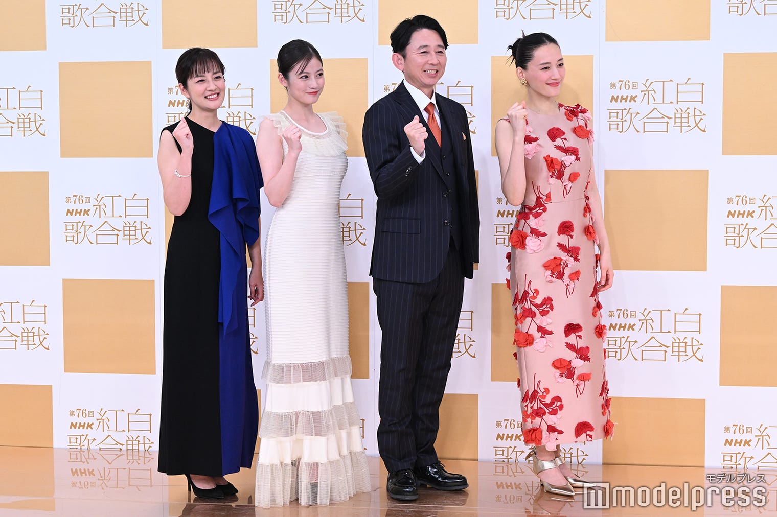 「第76回NHK紅白歌合戦」で司会を務める綾瀬はるか、有吉弘行、今田美桜、鈴木奈穂子アナウンサーが3...