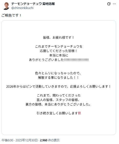 吉本のお笑いコンビ・チーモンチョーチュウ、解散発表「色々とムリになっちゃったので」2001年結成