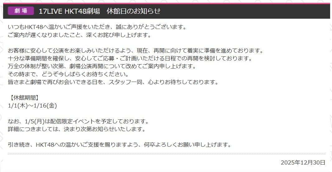 HKT48の公式サイトが12月30日に更新され、「17LIVE HKT48劇場」の一時休館を発表した...