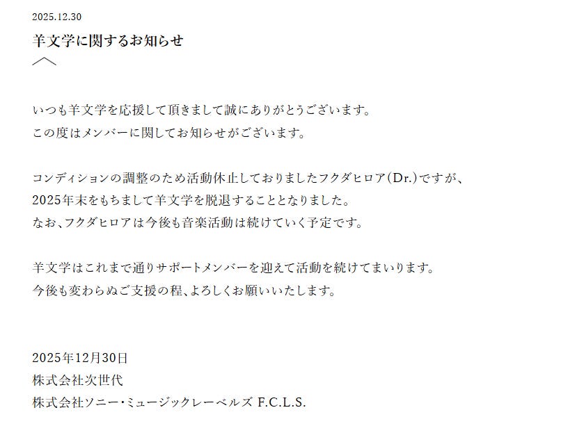 3人組ロックバンド・羊文学が12月30日、公式サイトを更新。ドラムのフクダヒロアが、2025年末をも...