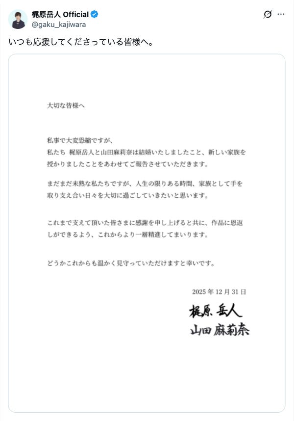 声優の梶原岳人(31)が12月31日、自身の公式X(旧Twitter)を更新。元HKT48の山田麻莉...