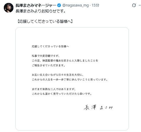長澤まさみ、元日に結婚を発表 お相手は映画監督・福永壮志氏「お互い支え合いながら」【全文】
