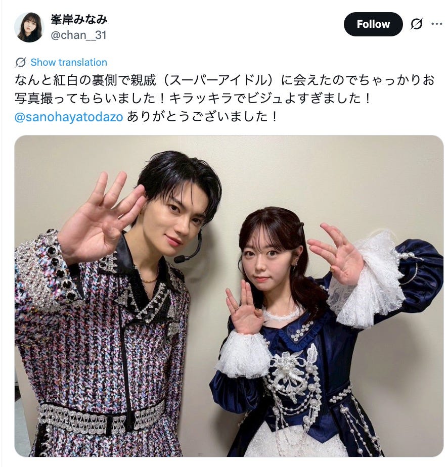 峯岸みなみ「紅白」裏側で“親戚スーパーアイドル”と2ショット「激アツすぎる」「血縁関係強い」と反響