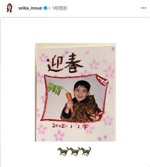 フジテレビの井上清華アナウンサーが1月5日、自身のInstagramを更新。幼少期の年賀状を公開し、...
