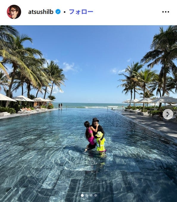 お笑いタレントの田村淳が1月5日、自身のInstagramを更新。ベトナム・ダナンで娘2人とプールを...