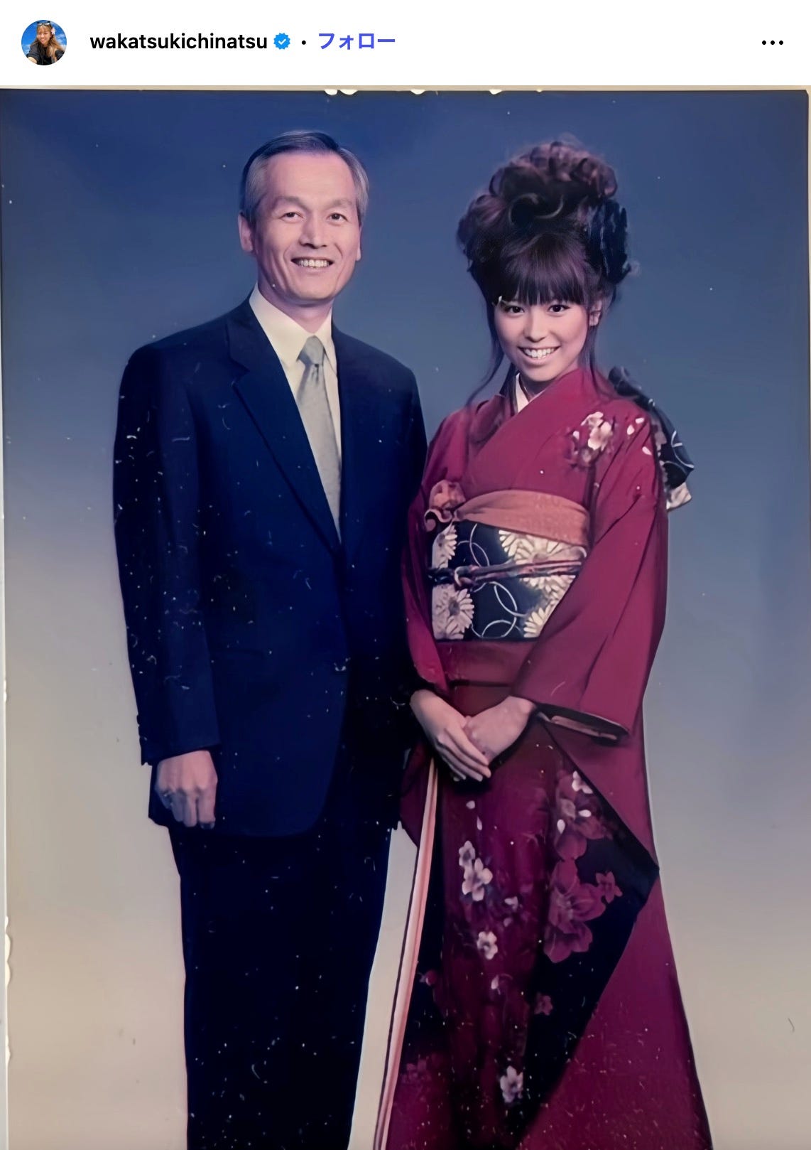 若槻千夏「顔より大きな髪型」成人式での振袖姿公開 父親顔出し2ショットに「髪型に時代感じる」「鼻と口元がそっくり」の声