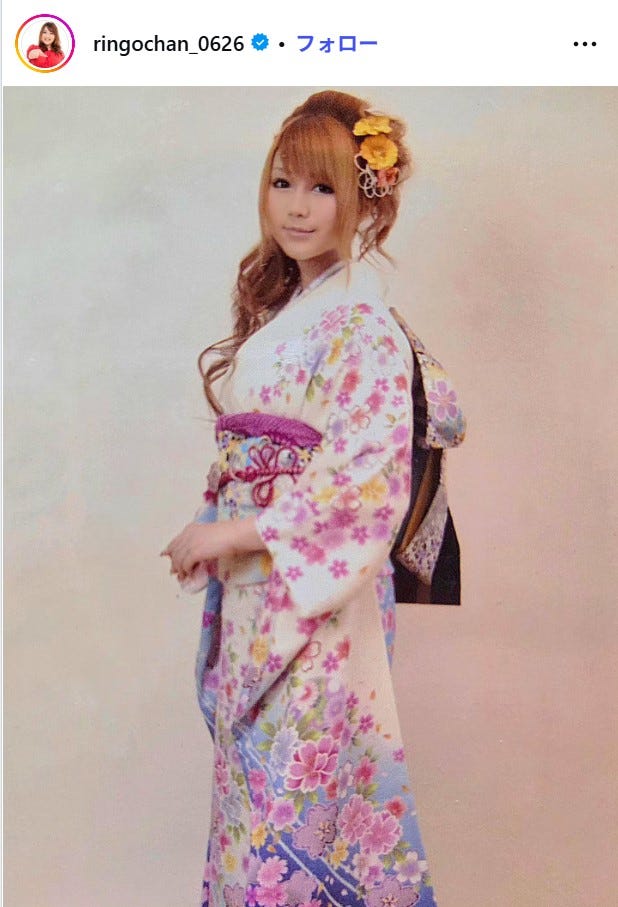 ものまねタレントのりんごちゃんが1月12日、自身のInstagramを更新。成人式の写真を公開し、反...