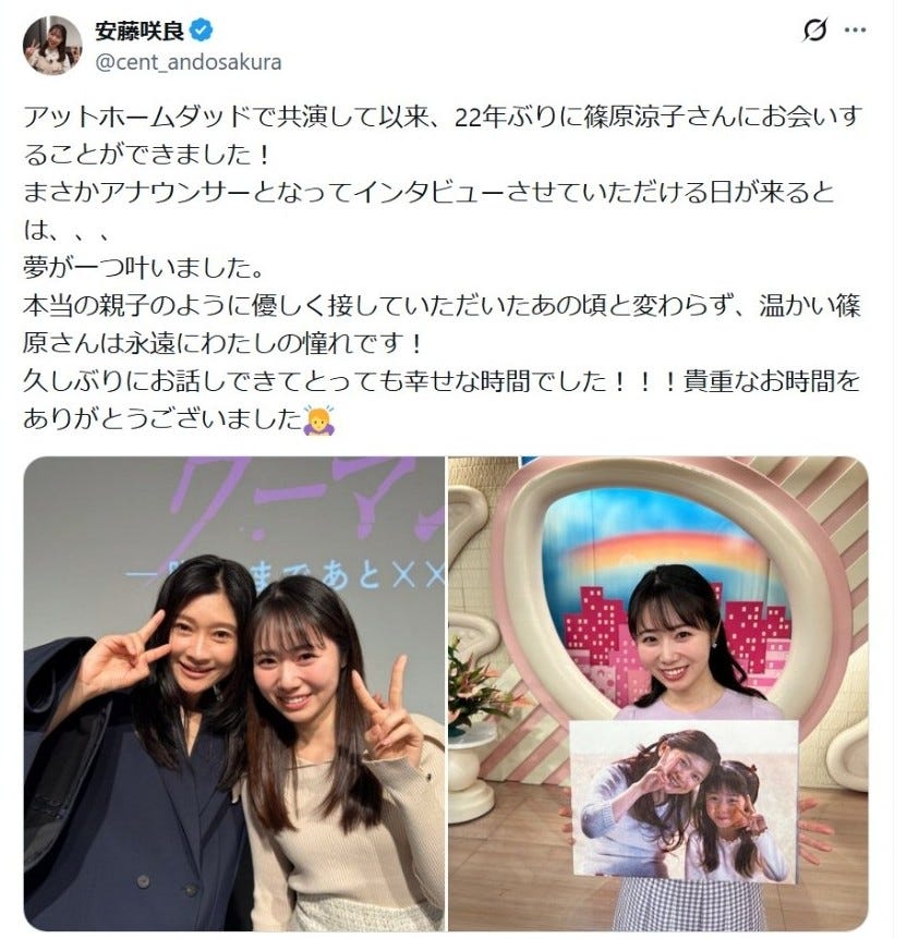 篠原涼子、親子演じた元子役のアナウンサーと22年ぶり再会で涙「確かに面影ある」「成長しててエモすぎ」感激の声相次ぐ