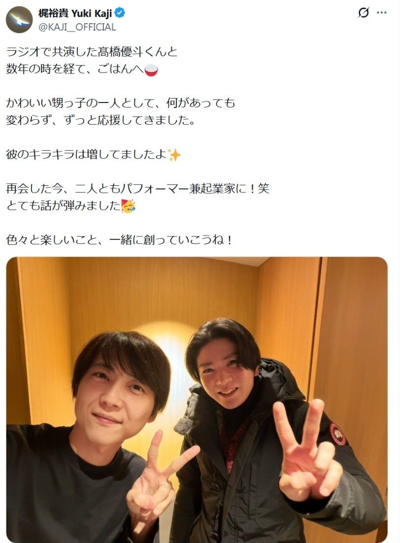 声優の梶裕貴が14日、自身のX(旧Twitter)を更新。高橋優斗(※「高」は正式には「はしごだか」...