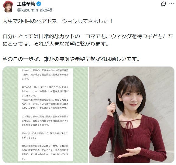 AKB48の工藤華純が1月16日、自身のX(旧Twitter)を更新。ヘアドネーションしたことを報告...