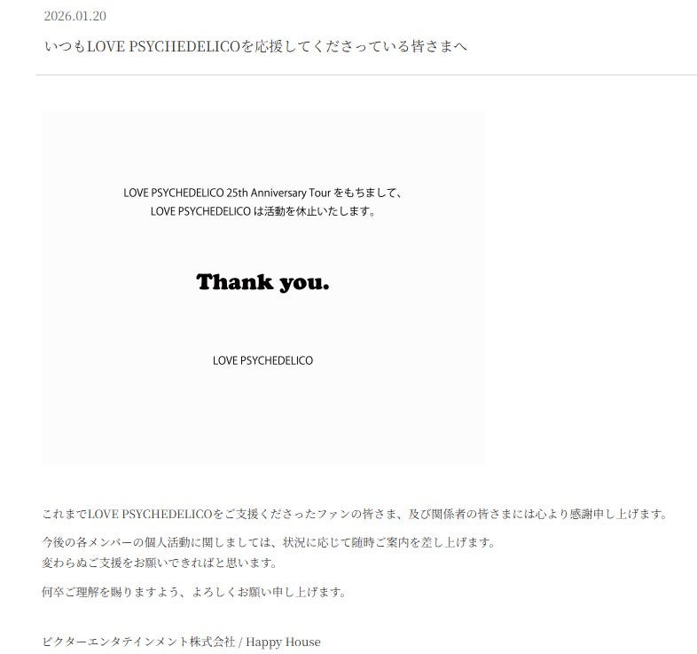 2人組ロックバンド・LOVE PSYCHEDELICO、活動休止を発表 デビュー25周年ホールツアーをもって