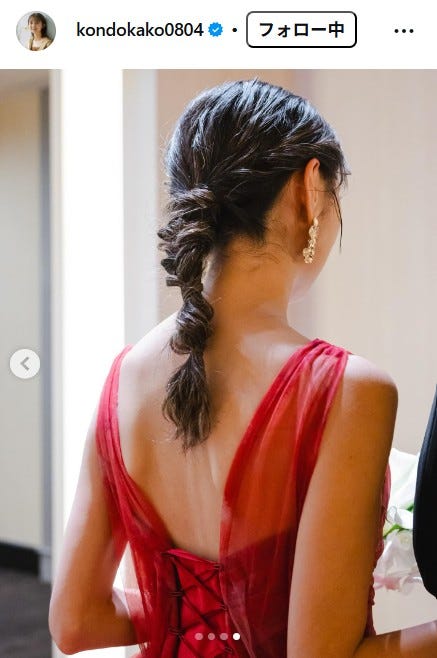 第1子妊娠中のTBS近藤夏子アナ、美背中際立つ真紅ドレス姿披露 お色直しショットに「新鮮だけど似合う」「芸術作品のよう」の声