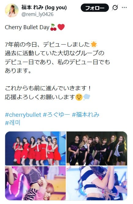 log you福本れみ、所属していた「大切な」Cherry Bulletのデビュー日祝福&メンバーとの写真公開「宝物みたいな関係で泣ける」「チェリバレは永遠」と反響