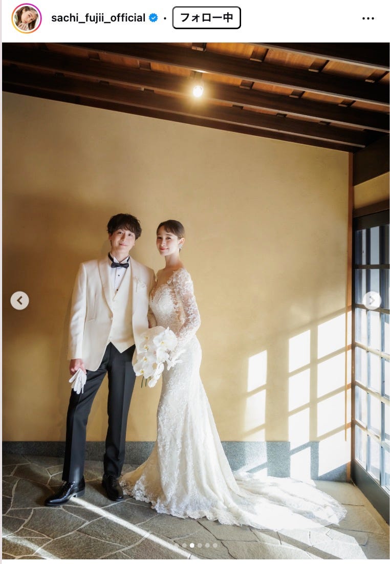 モデルの藤井サチが2026年1月24日、自身のInstagramを更新。夫とのウエディングショットを...