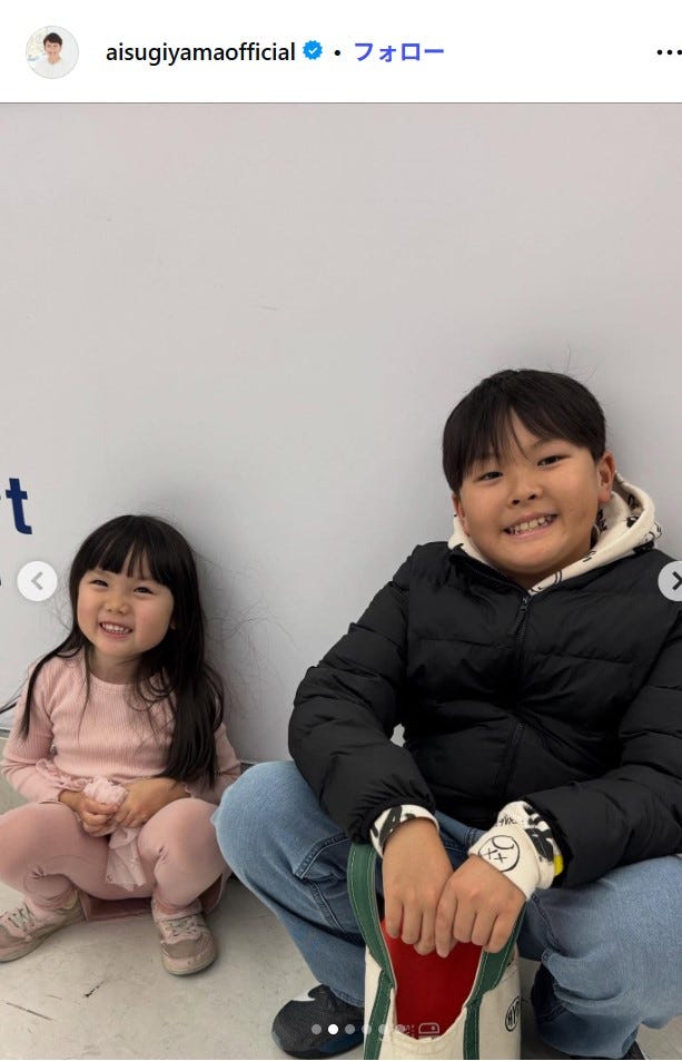 元プロテニス選手でタレントの杉山愛が1月26日、自身のInstagramを更新。子供たちの顔出し2シ...