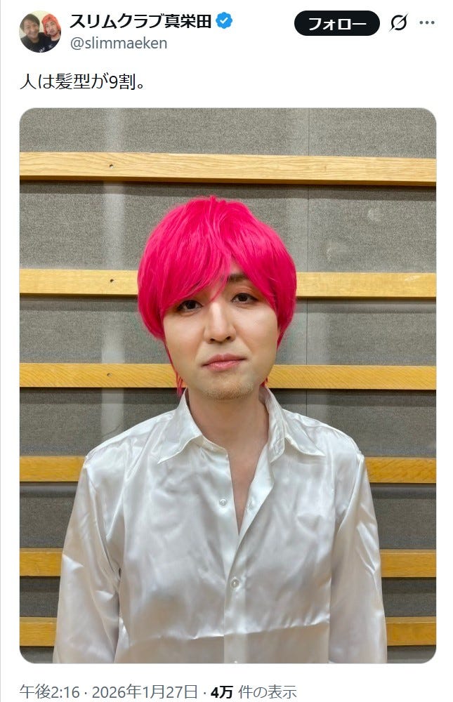 お笑いコンビ・スリムクラブの真栄田賢が1月27日、自身のX(旧Twitter)を更新。相方の内間政成...