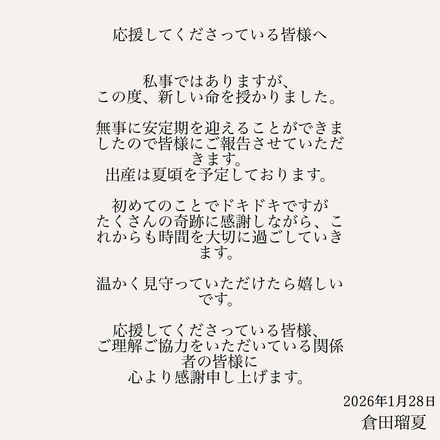 元「アイドリング!!!」メンバーの倉田瑠夏(29)が1月28日、自身のSNSを更新。第1子妊娠を発表...