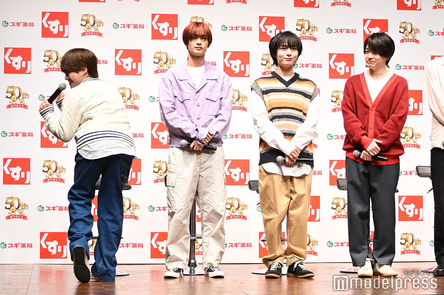 いつものように「プリン食べすぎて、お尻プリンプリン!なにわ男子のリーダー、大橋和也です!」と元気いっぱいに挨拶する大橋和也、気に留めず真っ直ぐ前を見据える高橋恭平、笑いがこらえきれない大西流星、大橋の強心臓の行方を見届ける西畑大吾(C)モデルプレス