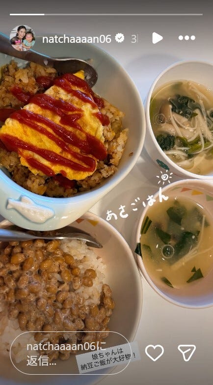 R-指定の美人妻、娘の好物朝ごはん公開「納豆好きな娘ちゃん可愛い」「オムライスは息子さんかな?」の声