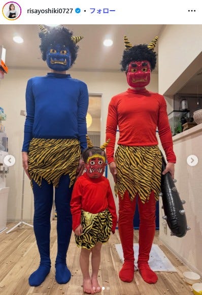 タレントの吉木りさが2月3日、自身のInstagramを更新。夫で俳優の和田正人と長男と鬼の扮装をし...