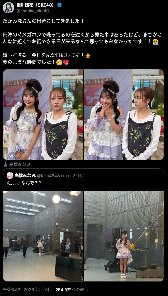 “たかみな再現”話題のSKE48相川暖花、高橋みなみ本人と対面「衣装で出待ち斬新」「姉妹みたい」の声
