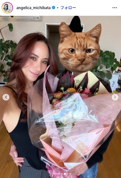 道端アンジェリカ「結婚記念日&お誕生日」夫との密着2ショット公開「ラブラブで微笑ましい」「花束が豪華」と反響