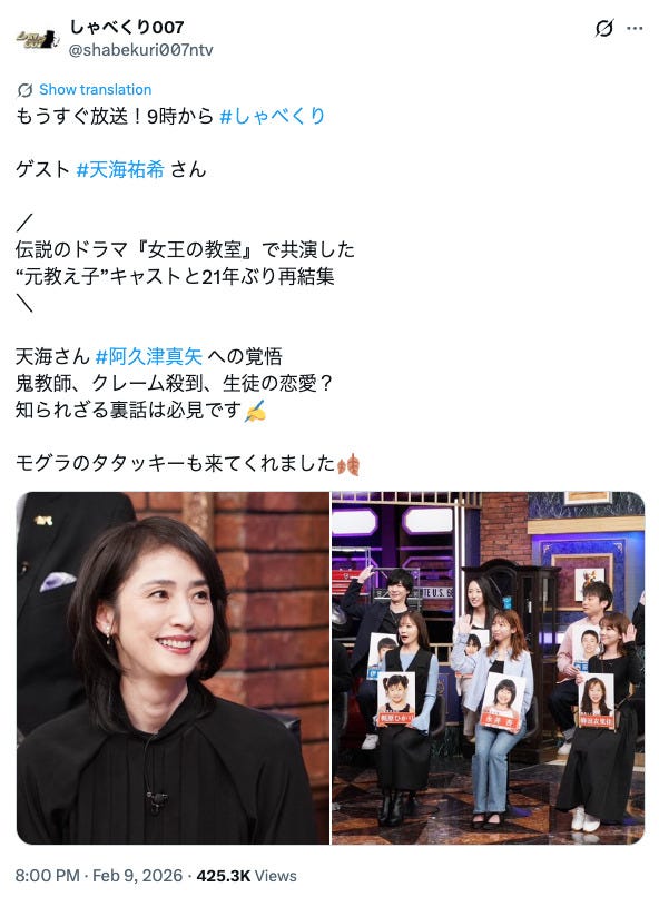 女優の天海祐希が、9日放送の日本テレビ系「しゃべくり007」(よる9時~)に出演。自身が主演を務めた...