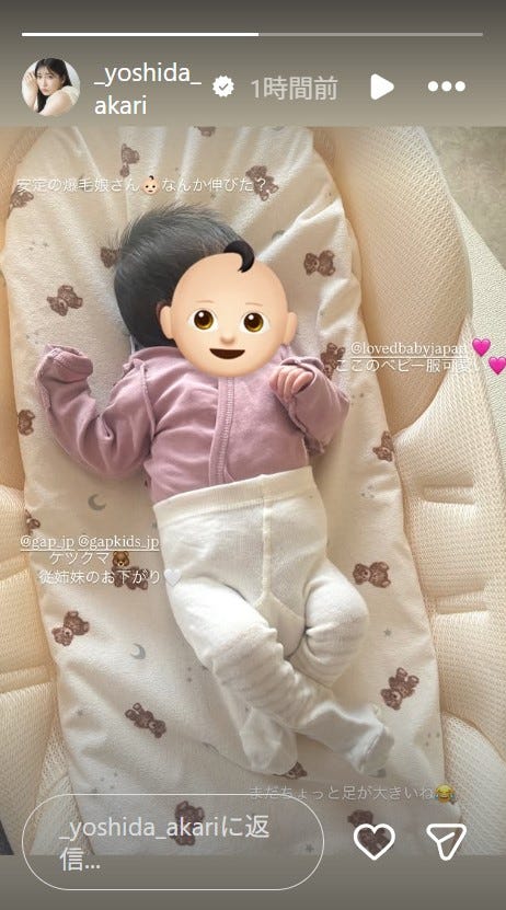 第1子出産の元NMB48吉田朱里「安定の爆毛娘」従姉妹のお下がり着用ショット公開「成長が早い」「癒される」の声