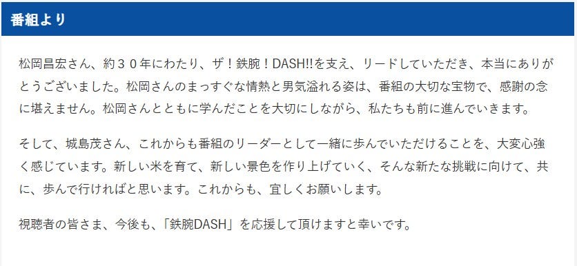 日テレ「ザ!鉄腕!DASH!!」公式サイト、元TOKIO松岡昌宏&城島茂へコメント掲載「感謝の念に堪えません」「大変心強く感じています」