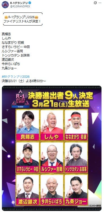 「R-1グランプリ2026」9人のファイナリスト決定 ふかわりょう・キンタロー。ら準決勝敗退に