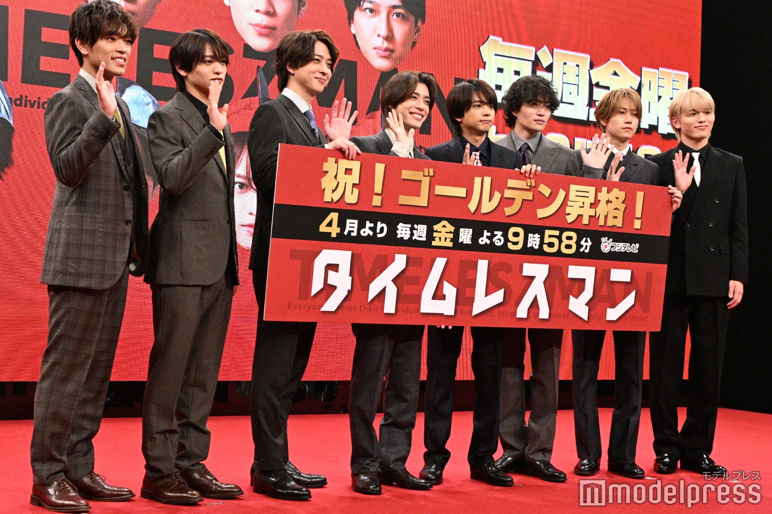 メンバーカラーのネクタイをしたスーツ姿で登場したtimelesz(左から)原嘉孝、猪俣周杜、寺西拓人、松島聡、佐藤勝利、菊池風磨、橋本将生、篠塚大輝(C)モデルプレス