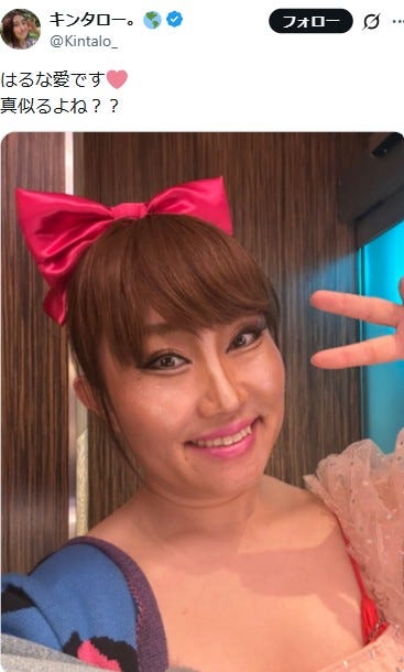 お笑いタレントのキンタロー。が2月17日、自身のX(旧Twitter)を更新。タレントのはるな愛のモ...