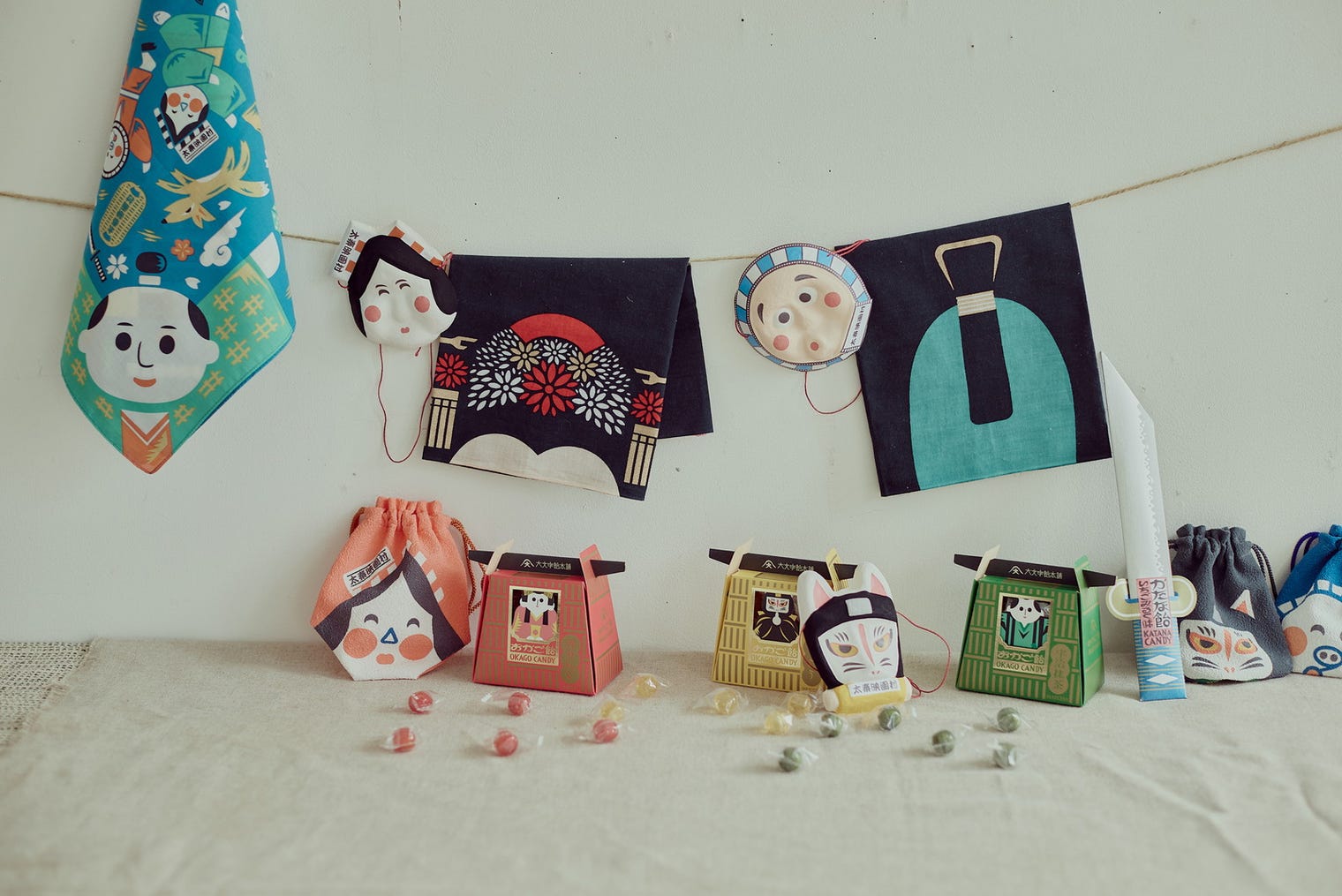 おかご飴(各味)900円、かたな飴800円、映画村時代劇なりきり手ぬぐい(各デザイン)1,600円他/提供画像