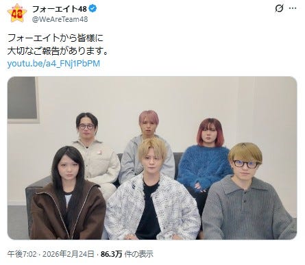 YouTuberグループ・フォーエイト48が2026年2月24日、グループのYouTubeチャンネル...