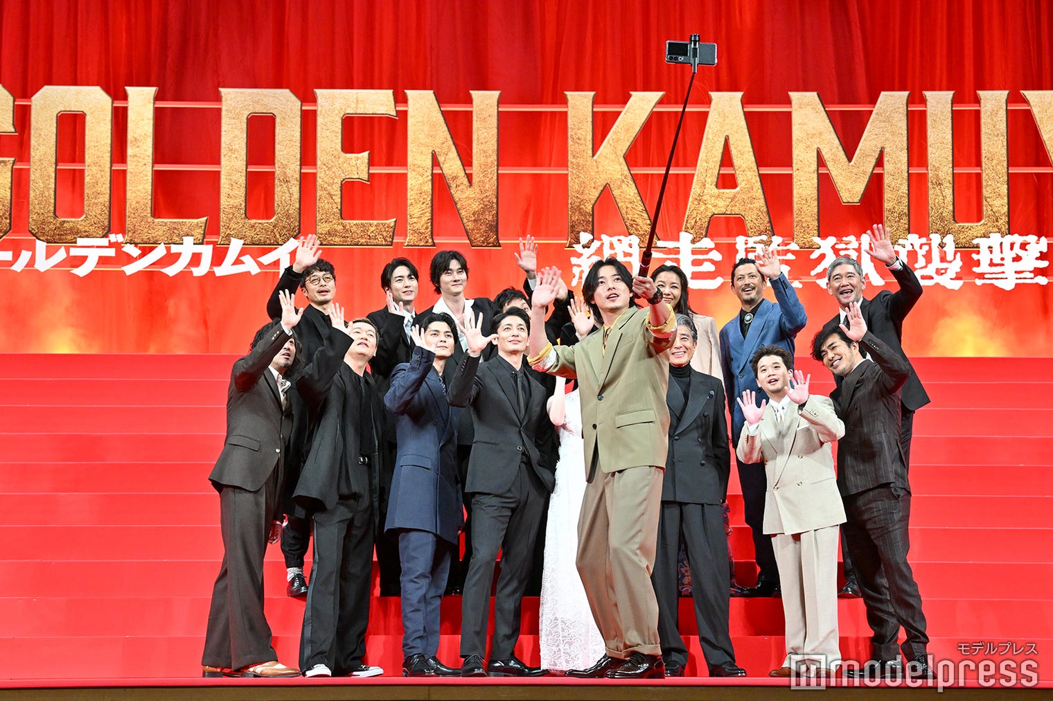 「ゴールデンカムイ 網走監獄襲撃編」完成披露舞台挨拶で自撮りをする山崎賢人ら(C)モデルプレス