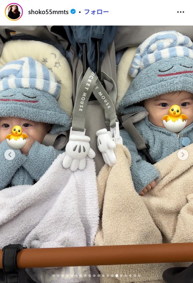 中川翔子「可愛すぎてゲット」双子のお揃いロンパース姿披露「ムチムチ感が可愛い」「ハンサムな兄弟」と反響