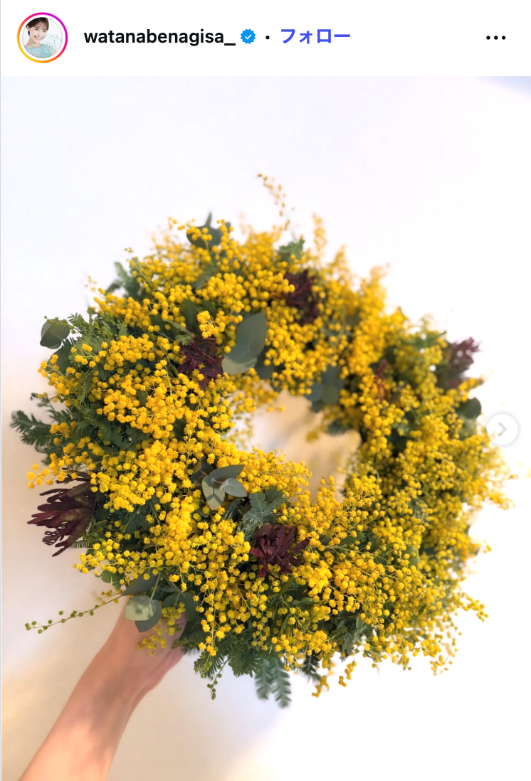 渡邊渚、ミモザの手作りリース披露「綺麗」「工夫がすごい」の声