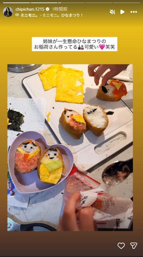 3児の母・近藤千尋、娘たちが“お雛様風”いなり寿司作る様子公開「器用ですごい」「微笑ましい光景」の声