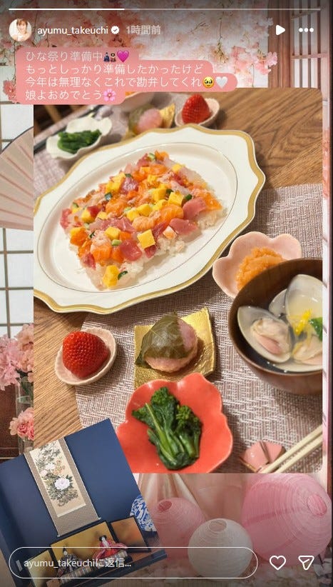 俳優・白洲迅の妻でタレントの竹内渉が3月3日、自身のInstagramストーリーズを更新。ひな祭りの...