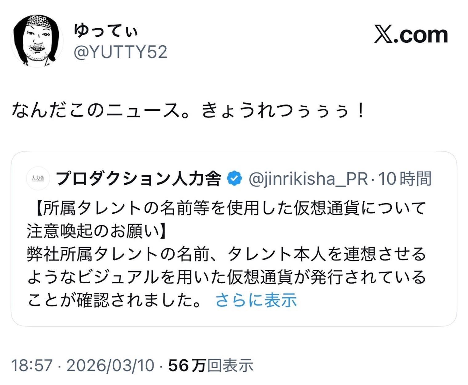 ゆってぃを連想させる仮想通貨「Yuttycoin」に人力舎が注意喚起「全く関与をしておりません」本人も驚き「きょうれつぅぅぅ」