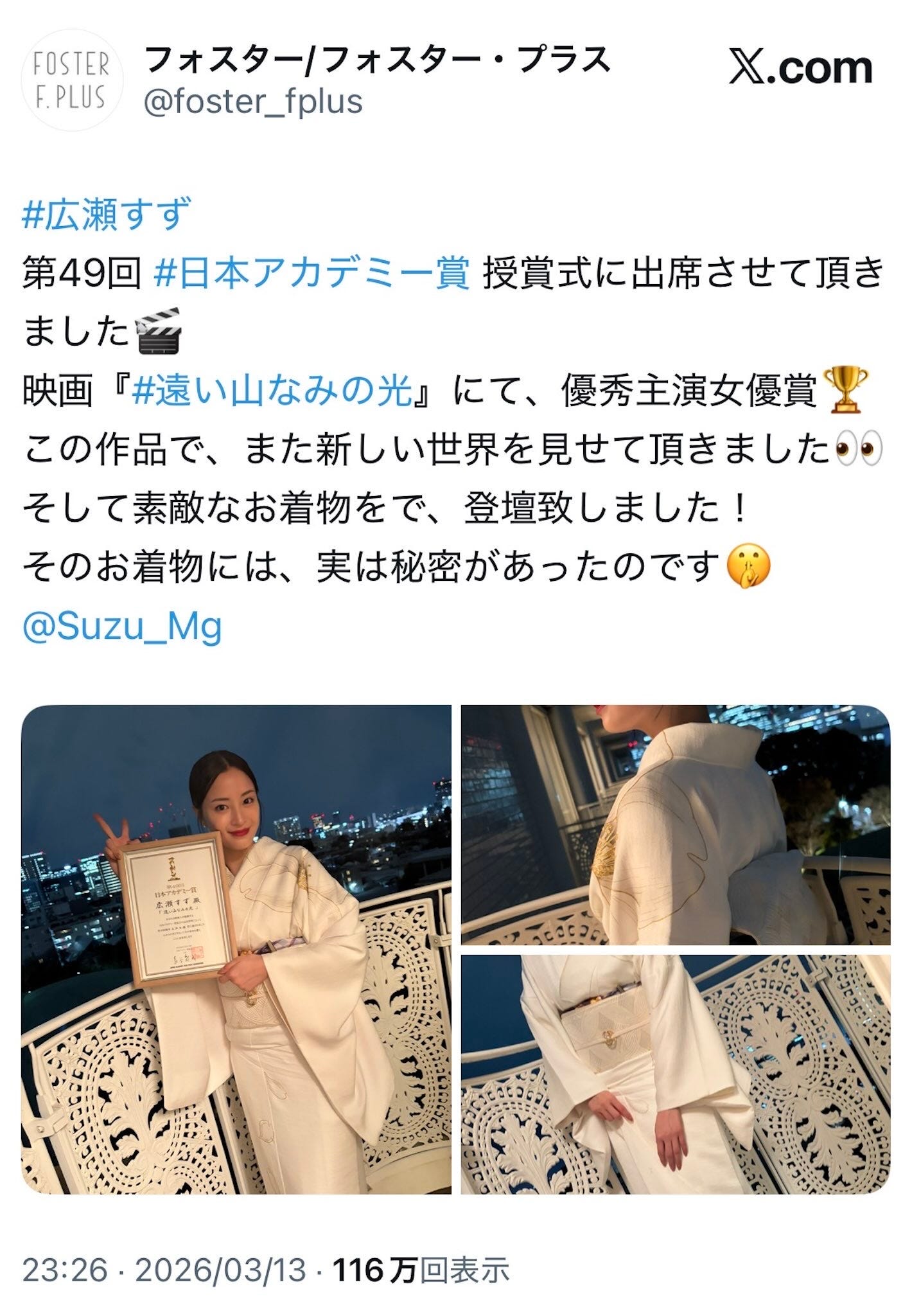 女優の広瀬すずが3月14日、自身のInstagramを更新。3月13日に東京・グランドプリンスホテル...