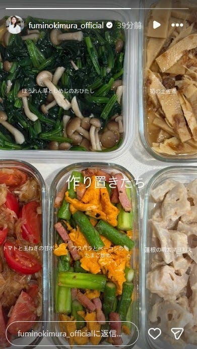女優の木村文乃が3月15日、自身のInstagramストーリーズを更新。5種類の作り置きおかずを公開...