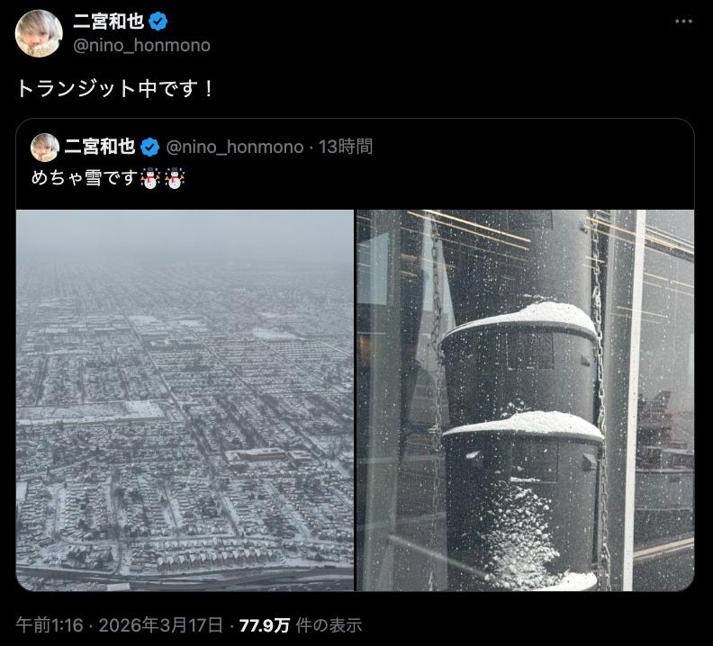嵐の二宮和也が3月17日、自身のX(旧Twitter)を更新。『ワールド・ベースボール・クラシック(...
