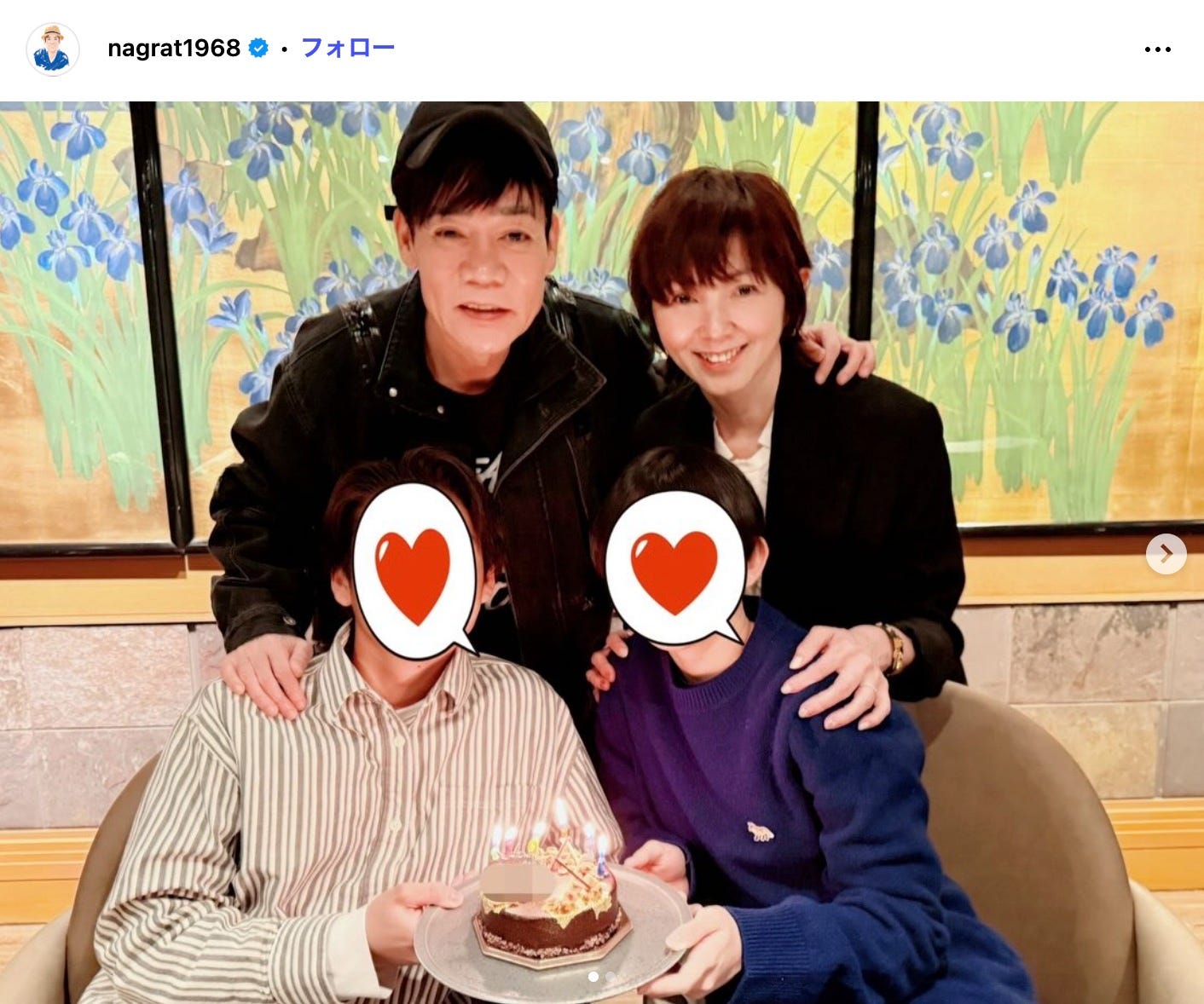 お笑いトリオ・ネプチューンの名倉潤が3月18日、自身のInstagramを更新。家族ショットを公開し...