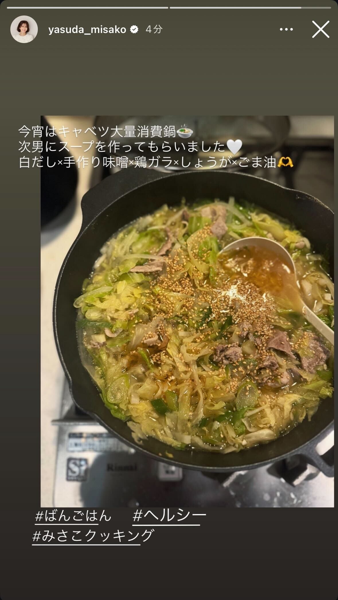 2児の母・安田美沙子、次男と作った「キャベツ大量消費鍋」に反響「栄養満点」「真似したい」