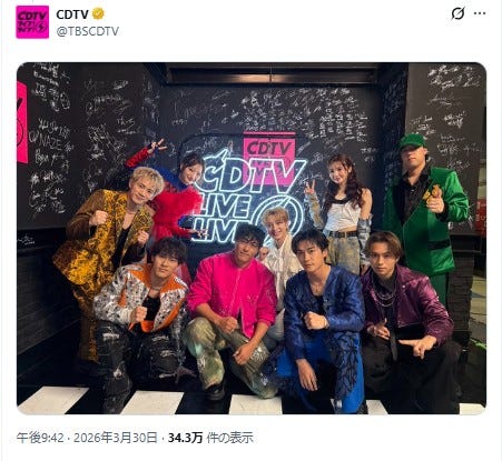 FANTASTICSの公式X(旧Twitter)が、3月30日に更新された。同日の「CDTVライブ!...