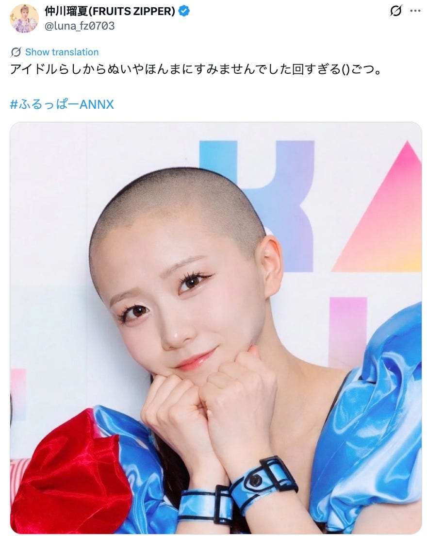 FRUITS ZIPPER仲川瑠夏、真中まなの“丸刈り”姿投稿に反響「アイドルらしからぬ姿すぎる」「インパクト強い」の声