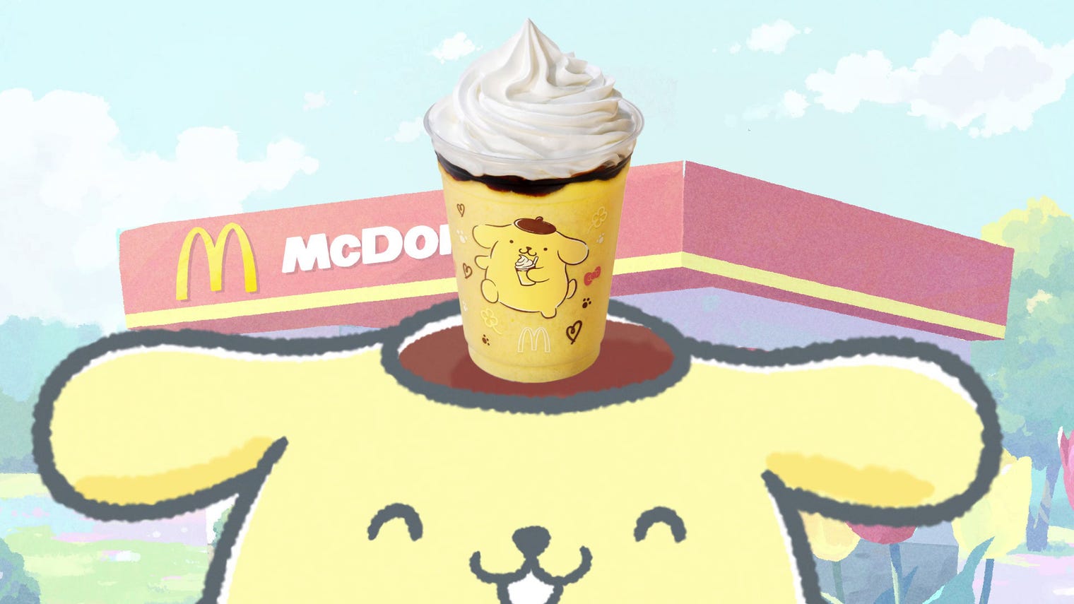 23. ポムポムプリンのクリーミープリンフラッペ/マクドナルド新CM「マックに甘いの飲みにこないか キティとプリン」篇より(提供写真)