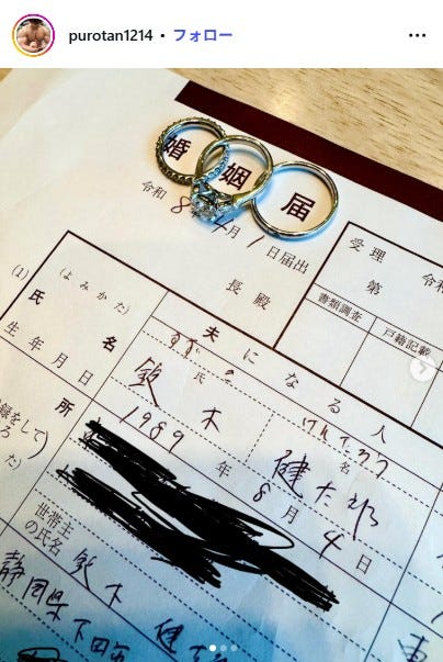 YouTuberのぷろたんが4月5日、自身のInstagramを更新。婚姻届に記載された名前に注目が...