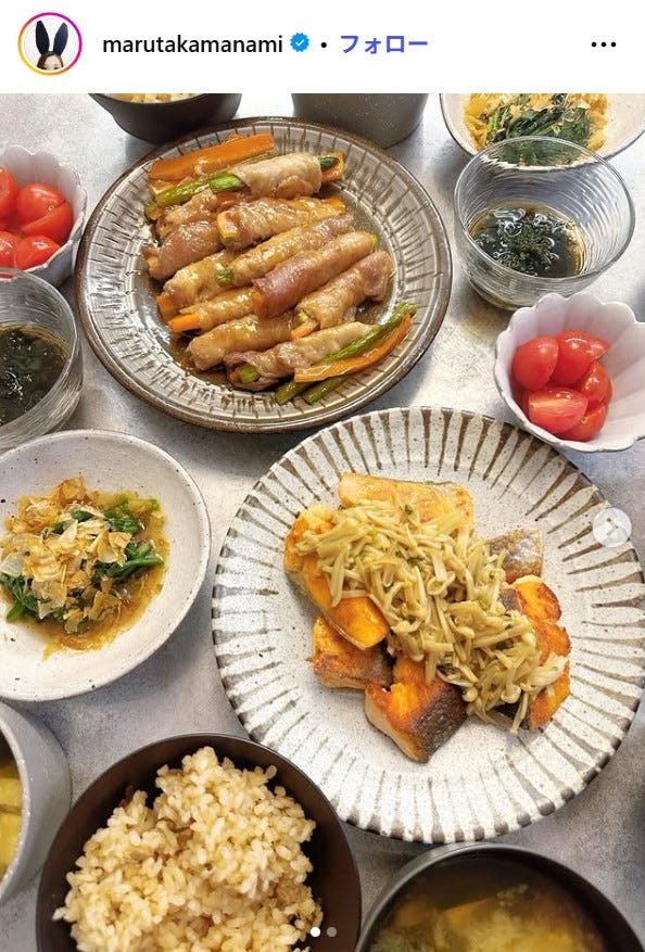 タレントの丸高愛実が4月6日、自身のInstagramを更新。家族が揃った日の夕食の食卓を公開した。